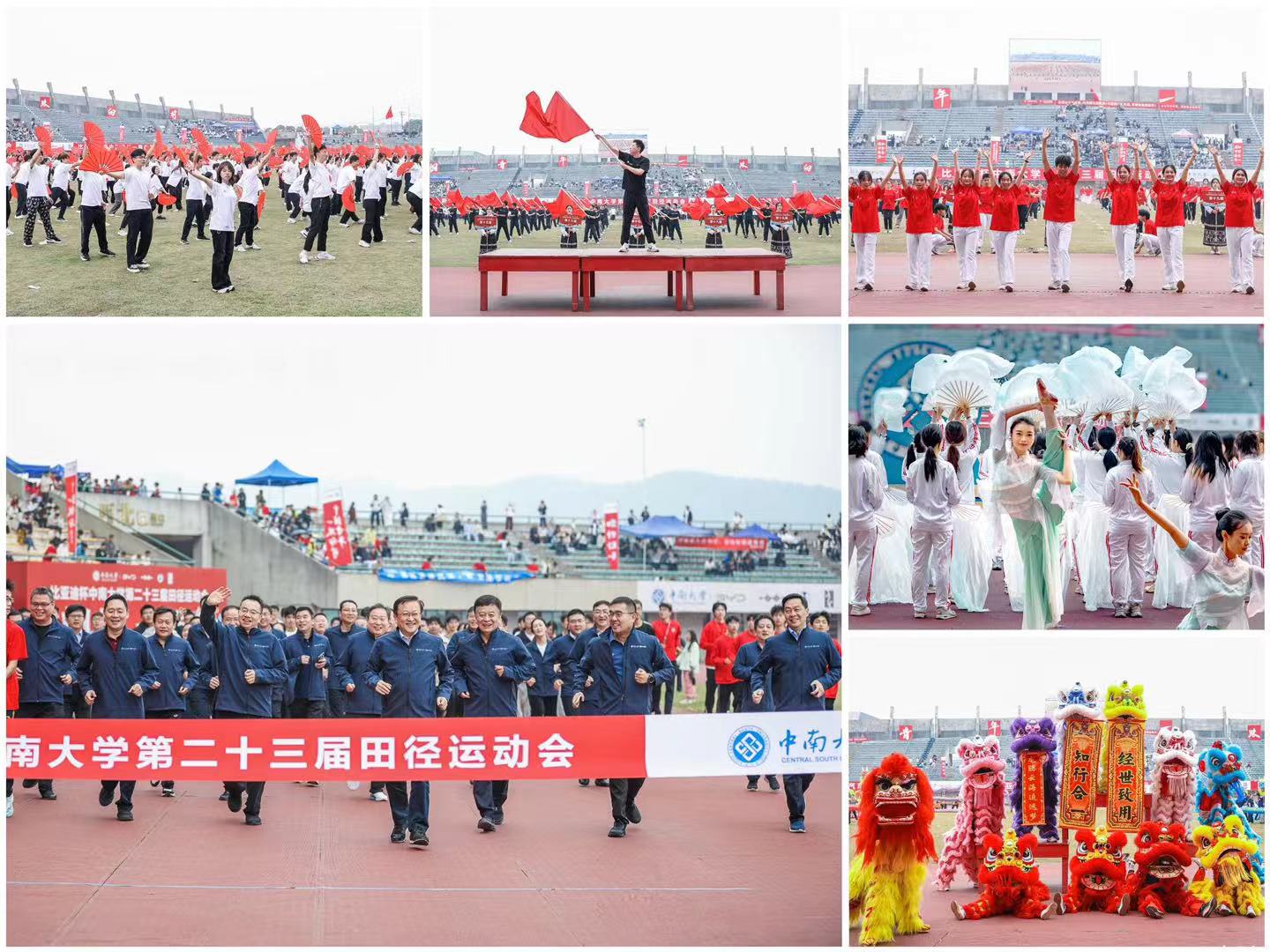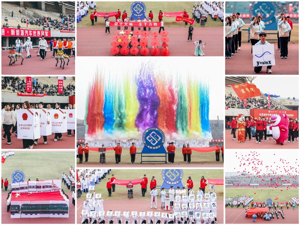 伴随着昂扬旋律,校徽、校旗方阵、中南大学联合比亚迪旗帜方阵、裁判员方阵、各参赛单位方阵及校高水平运动队方阵依次登场。现场创意纷呈、亮点不断:身着舞狮服的机械狗与身着宇航服模拟“太空漫步”的学子一同展示机电工程学院的科技活力;数学与统计学院学子手持函数板,随着音乐跳起“函数舞”,用肢体演绎正弦、余弦的曲线之美;土木工程学院架起测绘仪器,高举贵州花江峡谷壮丽图景,模型翻转间,一座大桥凌空架起;湘雅公共卫生学院方阵则以白衣为盾上演了一场“病毒阻击战”……30余个体现学科特色的创意方阵依次走过主席台接受检阅。文体表演环节,街舞、花样跳绳、广播操、武术表演和舞狮舞龙等节目轮番上演,中南学子以跑道与绿茵场为舞台,尽展蓬勃朝气。