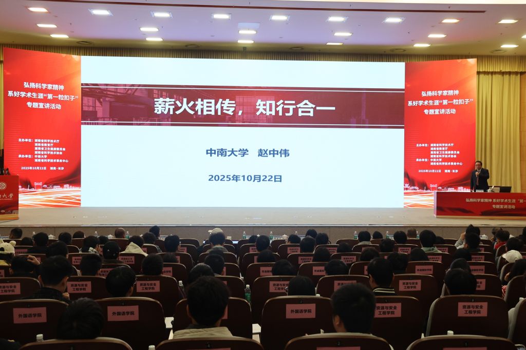 10月22日,湖南省2025年度“弘扬科学家精神 系好学术生涯‘第一粒扣子’”专题宣讲活动在中南大学举行。中国工程院院士、中南大学教授赵中伟作主题宣讲,分享科研心得与家国情怀。