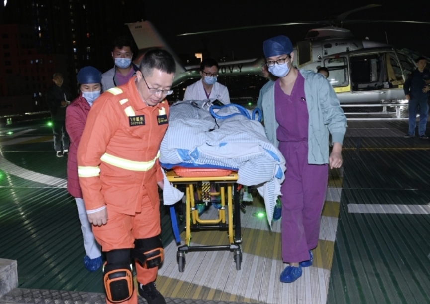 15时48分,经验丰富的医护转运小组乘直升机从医院起飞,17时55分抵达患者所在地后,医护团队迅速完成病情交接和空中转运准备,将患者稳妥安置于机载ICU单元,全程严密监护生命体征。20时50分,直升机平稳降落在湘雅二医院高架直升机场,地面急救团队无缝衔接,将患者通过绿色通道迅速送入手术室。
