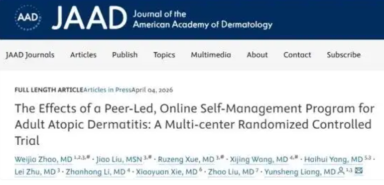 近日,中南大学湘雅二医院皮肤科梁云生教授团队联合南方医科大学皮肤病医院、珠海市第三人民医院、台州市中心医院等国内多家皮肤科中心,在国际权威期刊《美国皮肤病学会杂志》(Journal of the American Academy of Dermatology, JAAD,自然指数期刊,IF:11.8)发表原创性研究论文《患者领袖主导在线自我管理项目对成人特应性皮炎的影响:一项多中心随机对照试验》(The Effects of a Peer-Led, Online Self-Management Program for Adult Atopic Dermatitis: A Multi-center Randomized Controlled Trial)。该研究首次通过多中心随机对照试验证实,由经过标准化培训的特应性皮炎患者领袖主导的在线自我管理项目,可在度普利尤单抗或JAK1抑制剂等高效系统治疗基础上,进一步显著改善成人中重度特应性皮炎患者的疾病严重程度、用药依从性及心理健康,为特应性皮炎患者全程管理提供了新的循证依据和可推广的实践路径。