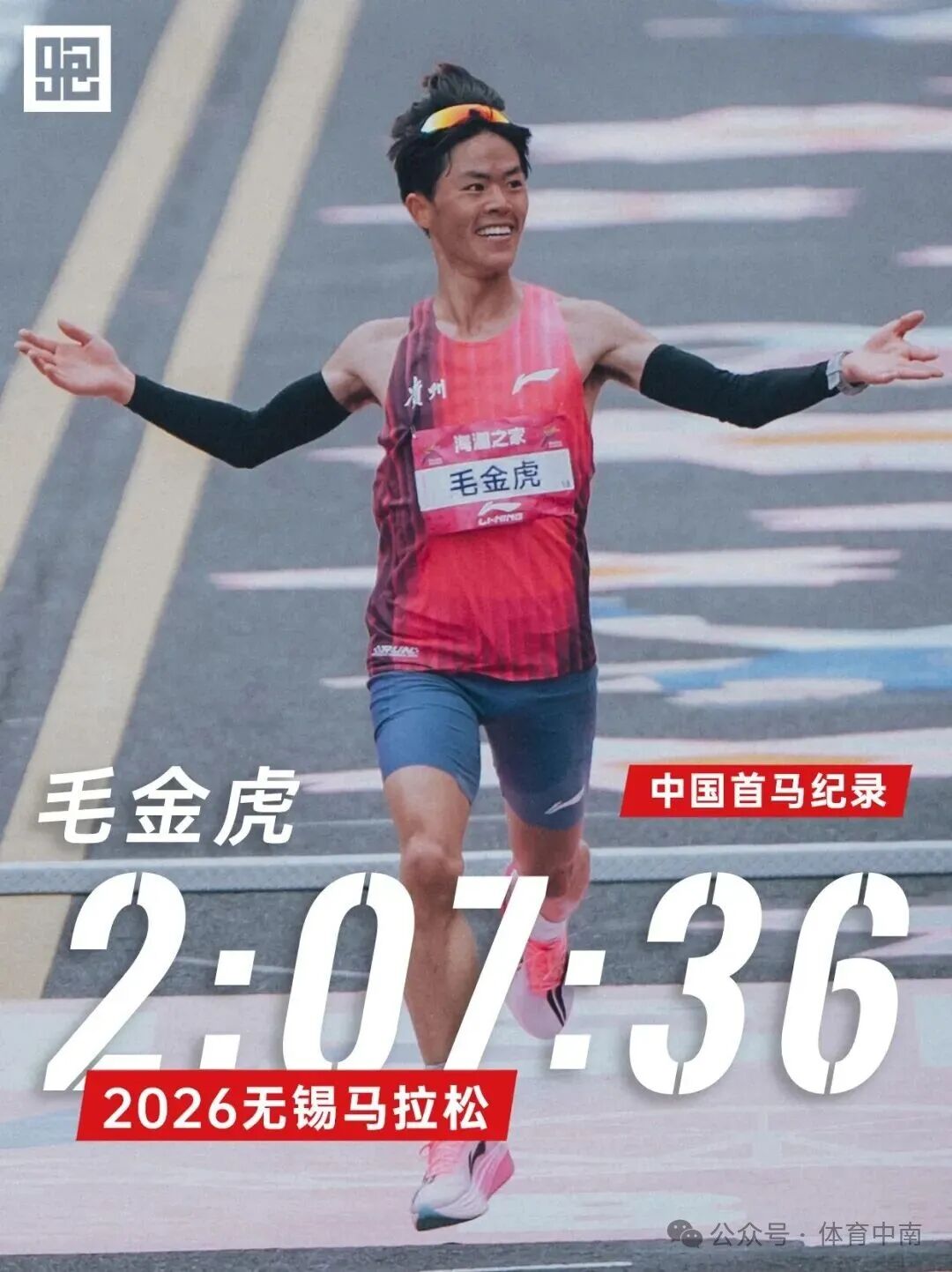 本网讯 3月22日,在无锡马拉松比赛上,中南大学体育教研部运动训练专业2024级本科生毛金虎以2:07:36的成绩完成自己的全马首秀,获得中国籍选手第一名、全场亚军,大幅度打破国内男子选手首马纪录(原纪录2:12:17,1987年)。此外,不久前刚在东京马拉松以2小时05分58秒刷新全国纪录的中南大学体育教研部运动训练专业2024级本科生丰配友,以2:08:10的成绩获全场第四、国内第二。