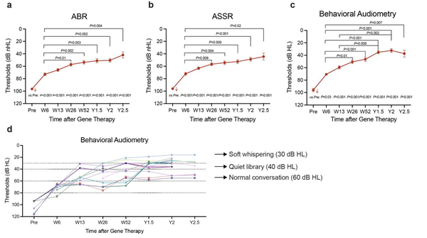 为突破单中心研究样本量相对小、随访时间短的临床瓶颈,由复旦大学附属眼耳鼻喉科医院牵头,联合中南大学湘雅二医院等8家单位,开展多中心临床试验,共纳入42名0.8–32岁受试者,覆盖婴幼儿至成人,开展最长2.5年随访。研究结果显示,2年随访的所有受试者听力水平均恢复到能听见日常交谈的声音,80%恢复到可识别图书馆级别的轻微背景音,60%恢复到能听到耳语声;2.5年随访的所有受试者听力水平均恢复到能听清日常交谈,57%可识别图书馆轻音,43%能听见耳语。此外,3名成年受试者中2名实现听力改善,进一步证实了基因治疗对成年耳聋患者的价值。