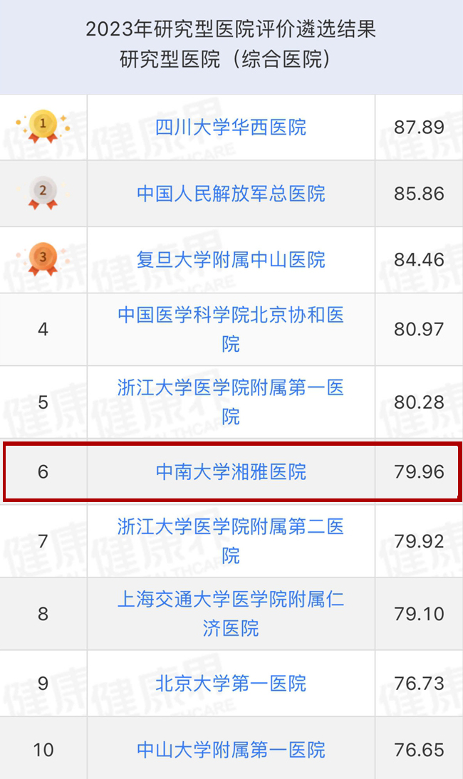 湘雅医院位列2023年研究型医院评价遴选第6位