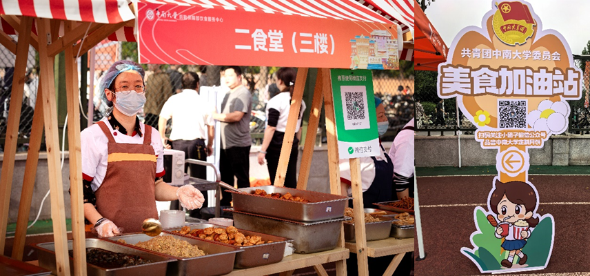 活动特别设置“游园打卡”环节,同学们穿梭于各展位之间,体验互动、收集贴纸,兴致盎然。中南小团子“美食加油站”联合后勤保障部饮食服务中心,贴心提供多样餐食饮品。