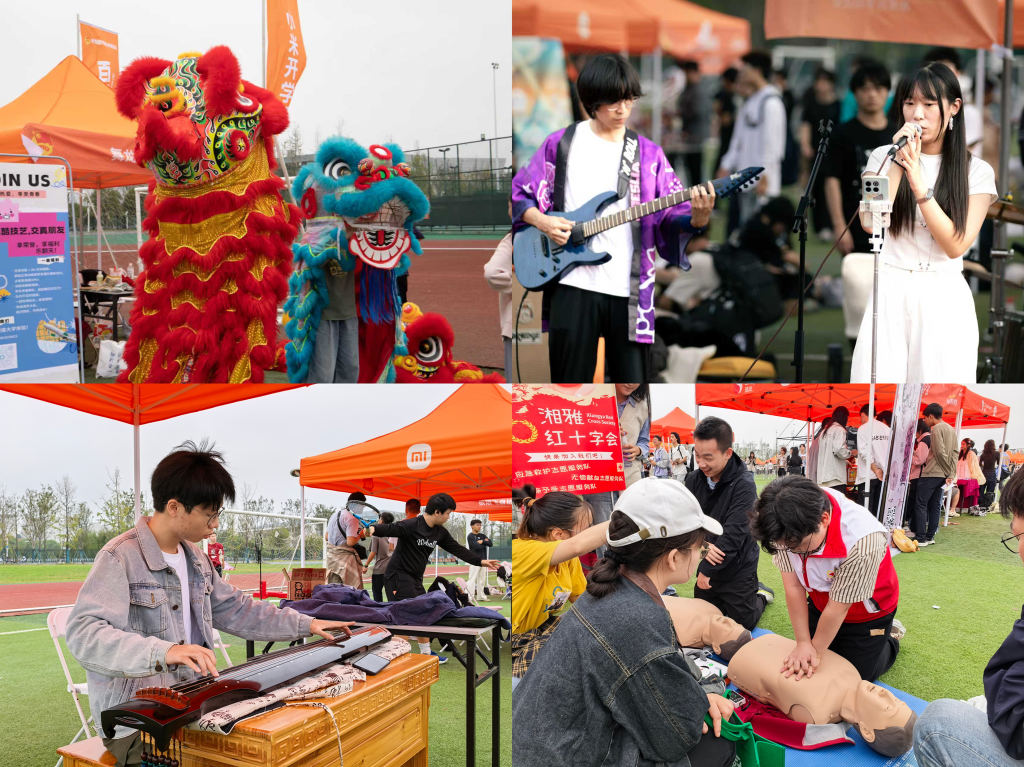 早晨8:00,绿茵场上已是人潮涌动。百余个社团展位涵盖文化、艺术、体育、科技、公益等多元领域,为新生快速融入校园搭建起桥梁。乒乓球协会的迷你球台前,同学们以球会友;拾遗社展位中,传统漆艺书签轻盈摇曳,引人驻足欣赏。玉霜戏曲社昆曲婉转、南熏诗社飞花令雅韵流长、猗兰古琴社琴声清雅、湘雅急救协会科普实用生动……各社团风采纷呈,点亮大学新生活的无限可能。