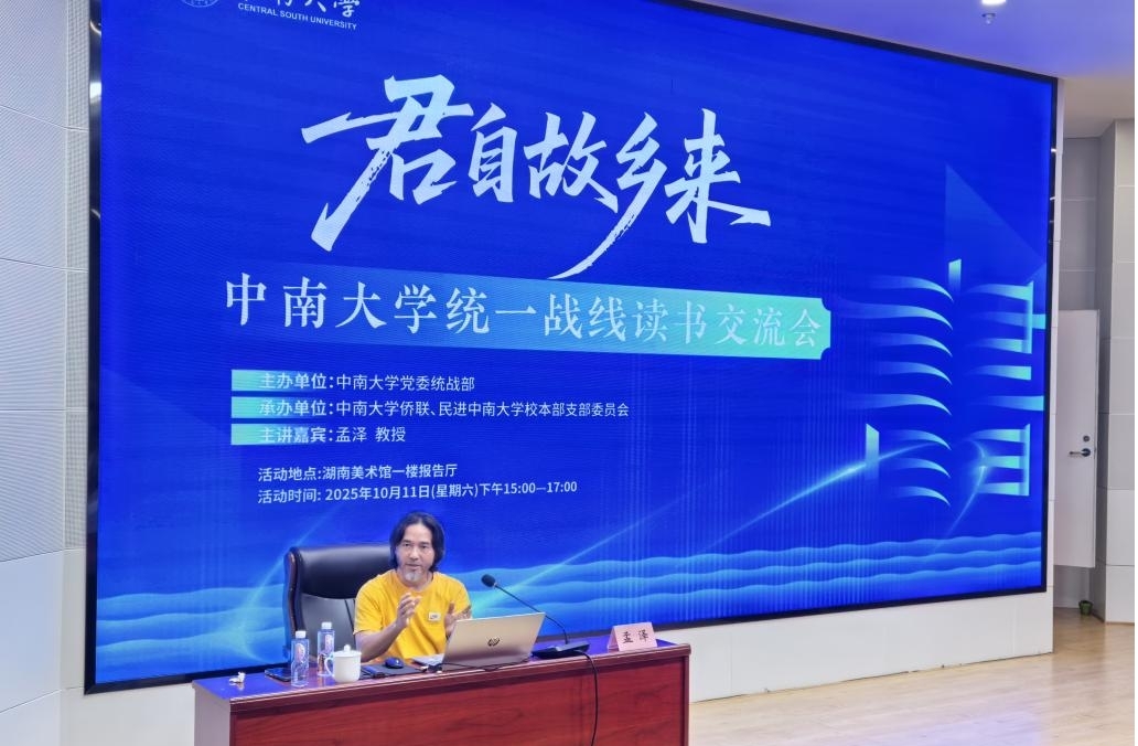 本网讯 10月11日,中南大学统一战线“君自故乡来”读书交流会在湖南美术馆举行。活动特邀中南大学外国语学院孟泽教授担任主讲嘉宾,围绕其著作《君自故乡来》及“人性的悖论与故乡的远方”主题展开阐释与交流。活动由中南大学党委统战部主办,中南大学侨联、民进中南大学校本部支部承办,民进湖南省委会专职副主委黄铁华,学校各民主党派成员、无党派人士、侨联、台联代表参加交流会。
