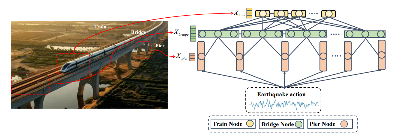 在结构工程及相关领域,桥梁、建筑、交通网络等动态系统的长期行为预测是保障安全、优化管理的关键,但现有技术存在计算慢、多尺度信息融合不足、远距离节点信息传递失衡等问题。为此,研究团队开展技术创新,提出了区域图神经网络(RGNN)框架,通过引入区域图表示(RGR)与细粒度重构(FGR)技术,将真实物理系统变为计算机所能理解的语言,选取系统关键部件作为节点,将耦合关系作为节点的连接关系,赋予节点和边对应的物理属性,实现了对系统动态特性的精准捕捉。