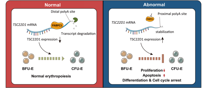 另一项发表于《基因组学、蛋白质组学与生物信息学》的研究聚焦红系分化中的选择性多聚腺苷酸化(APA)。团队通过整合不同阶段转录组数据,系统构建了动态APA图谱,发现红系分化早期普遍发生3′UTR(真核生物mRNA分子中位于终止密码下游尾巴之前的非编码区域)缩短,且与细胞周期和RNA调控通路密切相关。PABPC1(多聚腺苷酸结合蛋白胞质1号)被鉴定为介导BFU-E向CFU-E转变过程中APA的关键因子。功能实验证实,PABPC1敲低可抑制红系祖细胞增殖、促进细胞凋亡并阻碍CFU-E集落形成。结合三代全长转录组测序,研究揭示PABPC1通过APA调控TSC22D1(一个编码亮氨酸拉链转录因子的基因)表达,影响红系祖细胞扩增与分化,为红细胞生成的转录后调控机制提供了新见解。