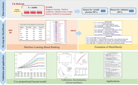 本图展示了基于UK Biobank 34万余人的前瞻性队列,通过机器学习构建 MetsObesity五层级肥胖代谢风险评估模型,进一步验证其在15年心血管事件预测中的区分度、校准度及临床应用价值的完整研究流程。