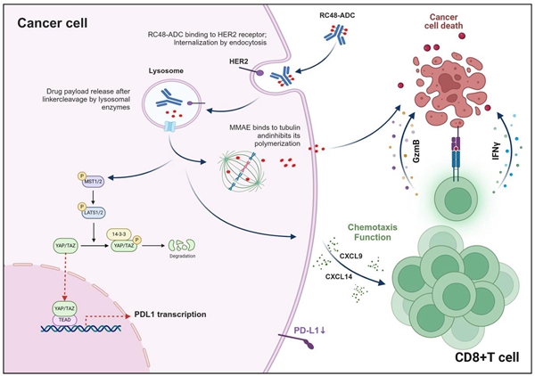 研究使用流式细胞术、免疫荧光、免疫细胞共培养、趋化实验、CUT&Tag检测、转录组学和酶联免疫吸附测定(ELISA)以及膀胱癌免疫治疗队列组织微阵列等方法,发现HER2表达与抑制性肿瘤免疫微环境和免疫治疗耐药性有关。RC48-ADC治疗可以重新激活这种HER2相关的抑制性肿瘤免疫微环境,从而增强免疫治疗效果。从机制上讲,RC48-ADC通过Hippo通路激活减少PD-L1转录来重新激活肿瘤免疫微环境。它还促进趋化因子(CCL5、CXCL9和 CXCL14)的释放并招募细胞毒性T淋巴细胞。在临床前小鼠模型中,RC48-ADC与CTLA-4和PD-L1抗体协同作用。总的来说,RC48-ADC通过Hippo-TAZ通路调控PD-L1,重激活CD8T细胞,增强免疫治疗,为膀胱癌提供了一种新的联合治疗策略。