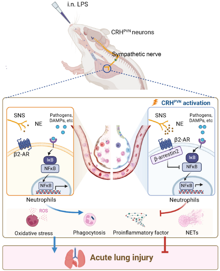 室旁核CRH神经元通过肺交感神经-中性粒细胞轴调节急性肺损伤的脑-肺互作机制图
