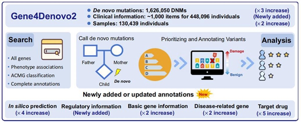 团队在《核酸研究》上发表题为“Gene4Denovo2:全面整合新发变异的数据库及分析平台(Gene4Denovo2: an updated platform for human de novo mutations discovery and interpretation)”原创性论著。新发变异(DNMs)是指在后代中出现,但在父母中未检测到的变异,通常产生于生殖细胞或受精后不久。研究表明,新发变异在神经精神疾病的发生发展过程中起重要作用。由于能够逃避进化选择压力,新发变异往往具有显著的功能破坏潜力;此外,它们还为那些无法通过遗传变异解释病因的散发病例提供了关键的临床证据。多次出现的新发变异,尤其是功能缺失性变异和有害错义变异,已经推动了大量与神经精神疾病相关的高置信风险基因的发现。该工作在团队此前发布的Gene4Denovo平台基础上进行了重大升级,旨在提供更全面的新发变异数据集及其解读功能。Gene4Denovo2提供了更大规模的新发变异数据集、更丰富的注释体系以及更强的分析能力,将有助于深入揭示新发变异在神经精神疾病中的致病机制,同时为ACMG中PS2/PM6条款提供了丰富的数据资源。中南大学生命科学学院硕士研究生朱召坡、博士研究生余佩和湘雅医院博士研究生毛鑫鑫为该论文的共同第一作者。中南大学生命科学学院、湘雅医院李津臣研究员和湘雅医院赵贵虎助理研究员为该论文的共同通讯作者。
