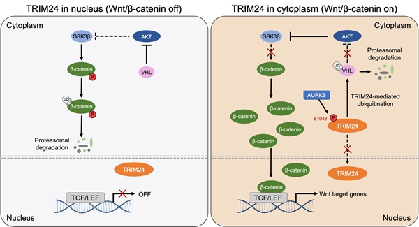 TRIM24(Tripartite Motif Containing 24)既往被认为是定位于细胞核的蛋白,而本课题组在前期研究中意外发现TRIM24在部分结直肠癌细胞中呈现显著细胞质分布。研究进一步表明,AURKB激酶能够磷酸化TRIM24蛋白的第1042位丝氨酸,从而驱动其在细胞质中的定位。胞质中的TRIM24可与AKT(蛋白激酶B)的负调控因子抑癌蛋白VHL相互作用,介导其泛素化降解以激活AKT,再经GSK3β(糖原合成酶激酶3β)促使β-catenin(β-连环蛋白)积累,最终激活Wnt/β-catenin信号通路,促进癌细胞增殖。此外,该信号轴的激活与APC和CTNNB1的突变状态无关。AURKB抑制剂可有效抑制TRIM24胞质定位显著的结直肠癌细胞的增殖,在动物实验中亦显示出显著的抗肿瘤活性。该研究既阐明了Wnt/β-catenin信号异常激活的全新调控机制,也为细胞质TRIM24分布明显的部分结直肠癌患者提供了潜在的靶向治疗思路。