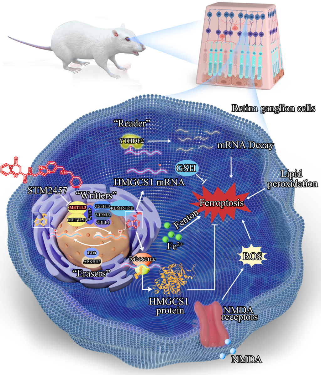 团队还在《国际外科杂志》(International Journal of Surgery)发表题为“抑制Mettl3介导的HMGCS1 m6A RNA甲基化修饰从而保护大鼠青光眼模型中的视网膜神经节细胞免受谷氨酸兴奋性毒性诱导的铁死亡(Inhibition of mettl3-mediated m6A RNA modification of HMGCS1 protects retinal ganglion cells from glutamate excitotoxicity-induced ferroptosis in a rat model of glaucoma)”的研究论文。该研究揭示在青光眼大鼠模型中,抑制甲基转移酶样蛋白3(Mettl3)介导的3-羟基-3-甲基戊二酰辅酶A合成酶(HMGCS)基因的N6-腺苷(m6A)RNA甲基化修饰可有效保护视网膜神经节细胞,使其免于谷氨酸兴奋性毒性诱导的铁死亡。研究证实,通过干预m6A表观转录调控机制,能够显著抑制铁死亡关键通路,减少神经节细胞的死亡,为青光眼的神经保护治疗提供了新的靶点与策略。中南大学湘雅医院眼科中心王超博士,2021级硕士研究生冯乐蒙为文章共同第一作者,夏晓波教授,宋伟涛副教授为论文通讯作者,中南大学湘雅医院为唯一通讯单位。