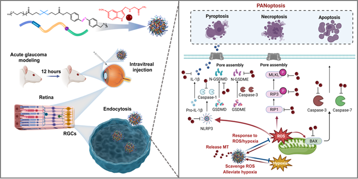 此外,团队在《诊断治疗学》(Theranostics)发表题为“活性氧/乏氧-双响应聚合物搭载褪黑素通过抑制视网膜神经节细胞泛凋亡作为急性青光眼的治疗方法(Reactive oxygen species/hypoxia dual-responsive polymers combined with melatonin inhibited PANoptosis of retinal ganglion cells for acute glaucoma treatment)”的研究论文。该研究开发了一种具有活性氧/乏氧-双响应特征的纳米材料聚合物用以搭载泛死亡抑制剂褪黑素(MT-NPs)。MT-NPs通过缓解乏氧、清除活性氧和抑制泛凋亡激活从而显著减少急性青光眼损伤后视网膜神经节细胞死亡并改善视功能。中南大学湘雅医院眼科中心2022级博士研究生孟书涵、2024级博士研究生方惟周为文章共同第一作者,夏晓波教授、丁乐溪副教授、周学智副研究员为论文通讯作者,中南大学湘雅医院为唯一通讯单位。