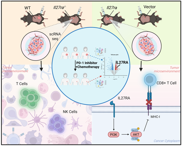 基于现状,研究团队对接受新辅助免疫治疗联合化疗的患者样本进行了单细胞转录组分析。研究表明,IL27RA通过激活PI3K/AKT(信号通路名称)信号通路,下调MHC-I(主要组织相容性复合体I类分子)并抑制抗原呈递相关基因表达,从而削弱CD8⁺ T细胞(免疫系统内一种重要细胞)介导的肿瘤杀伤效应。考虑到免疫治疗效应依赖肿瘤微环境,研究团队进一步构建IL27RA全身敲除小鼠并开展单细胞分析,结果显示系统性IL27RA缺失可重塑免疫生态:CD8⁺ T细胞趋化/炎症特征增强,NK细胞(免疫系统中的淋巴细胞)向更成熟、细胞毒性更强的谱系分化,整体支持“抑制IL27RA可增强PD-1(一种免疫检查点蛋白)阻断治疗敏感性”的结论。