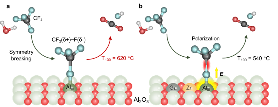 该研究提出了一种强有力的原子级局域电场(LEF)调控策略,实现了CF4的高效活化与分解。通过将Ga−Zn双原子引入Al2O3(命名为Ga1Zn1/Al2O3),产生了高度增强且空间限域的电场(~3×10¹⁰ N/C)。光谱表征揭示,该局域电场增强了邻近三配位Al(AlIII)位点的路易斯酸性,通过界面极化显著加强了CF4的吸附,并促进了C−F键的拉伸和断裂。因此,Ga1Zn1/Al2O3催化剂在540°C的超低温度下实现了CF4的完全转化,其表观周转频率比原始Al2O3高4.5倍,表观活化能降低近一半。该催化剂还表现出卓越的耐久性,在连续运行超过600小时内保持100%的转化率,显示了其强大的结构和催化稳定性。该研究确立了双原子诱导的局域电场工程作为一种活化超稳定氟碳化合物的强大策略,并为持久性全氟污染物的可持续降解提供了一条有前景的途径。