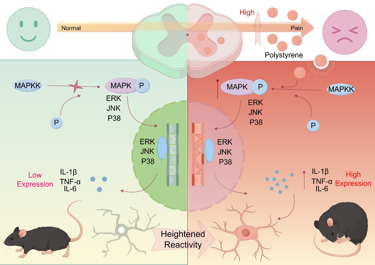 团队针对聚苯乙烯塑料相关企业180名工人的流行病学调查显示,暴露组疼痛强度评分是普通人群的2.4倍,57%的工人存在持续性疼痛,62%的工人疼痛敏感性增高,50%的工人具神经病理性疼痛特征,且疼痛敏感性与从业年限正相关。动物实验中,PS NPs暴露小鼠在3天后即出现机械痛和热痛超敏,早于认知异常。电生理证实,聚苯乙烯纳米塑料(PS NPs)导致脊髓背角神经元兴奋性升高,引发中枢敏化。机制上,脊髓背角中约42%的聚苯乙烯纳米塑料(PS NPs)被小胶质细胞内化,通过增强MAPK(丝裂原活化蛋白激酶)通路激酶磷酸化激活,上调IL-1β、IL-6、TNF-α等促炎因子,加剧神经元过度兴奋。小胶质细胞耗竭或MAPK抑制剂干预均能缓解疼痛超敏。