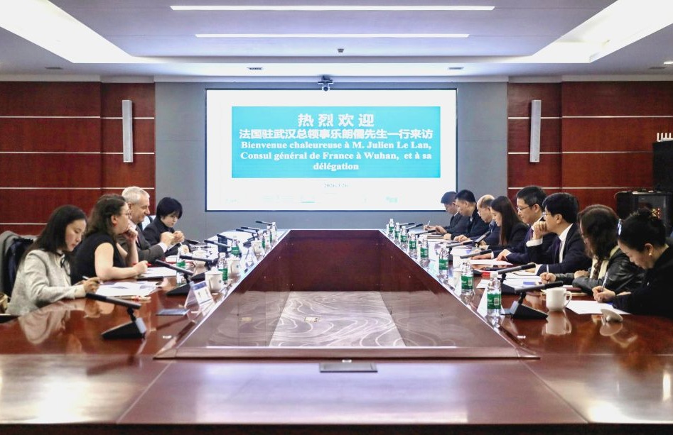 本网讯 3月26日上午,法国驻武汉总领事乐朗儒一行来访。中南大学副校长黎志宏,学校相关职能部门和二级学院负责人参加座谈交流。