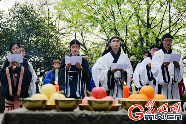 在清净澄明、庄严肃穆的长沙岳麓山蔡锷墓前,一群来自中南大学的学生尊承周礼,身着汉服,吟唱楚辞《国殇》,祭奠亡灵,缅怀先烈。