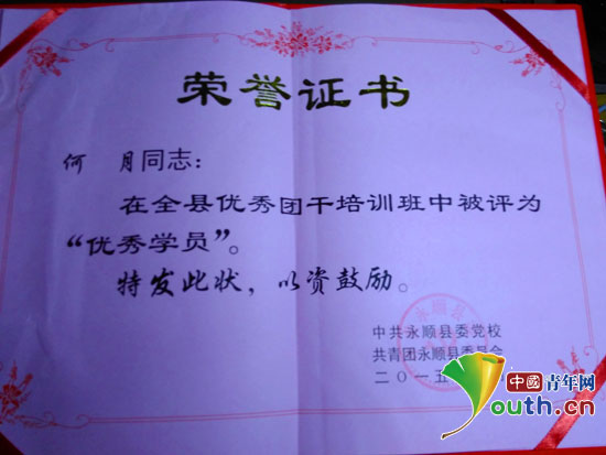 中南大学研究生支教团队员何月参加永顺县团干培训,并获“优秀学员”荣誉称号。何月 供图