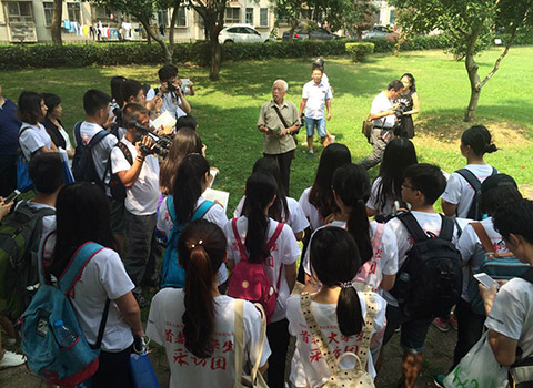 穿着凉鞋,背着小布包,一头白发剃得整齐利落,看见我们走近了,老人双手微微颤抖着从包里掏出自己准备的讲解资料和手稿。一开嗓,声音洪亮,整个人的精神就提起来了。面对着“民主楼”,姚老师给我们讲起了抗战中那段艰难求学的历史。