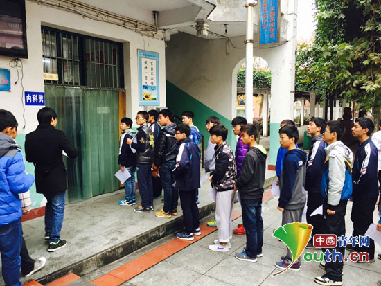 中南大学研究生支教团携手湘雅附三医院在永顺一中开展爱心体检。图为排队等待体检的学生。 毛慧悦供图