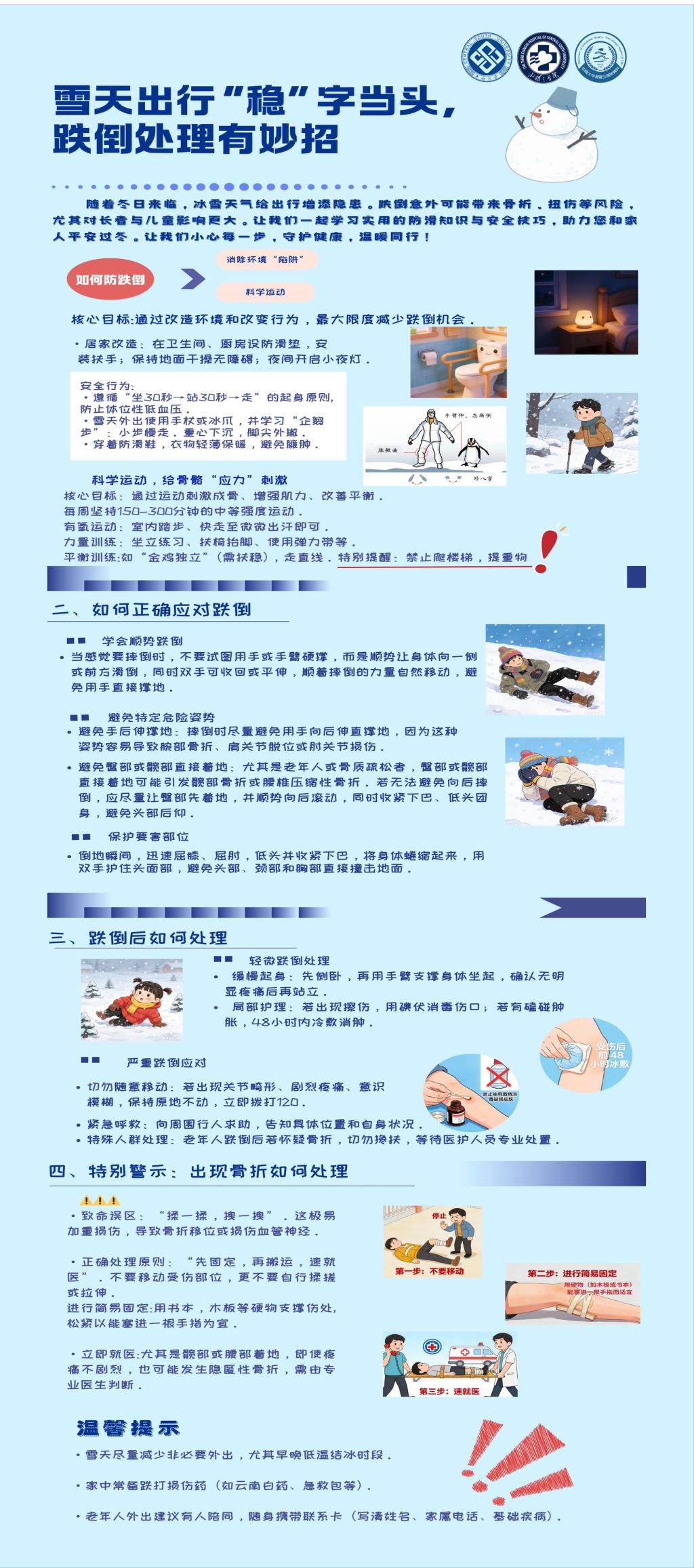 该院骨科主任医师罗令建议,雪天尽量避免外出,如必须外出行走,要避开机动车多的地方。走路时,可借助手杖,微屈膝关节、重心下沉、小步慢走。在感觉自己要摔倒时,快速蹲下,同时顺势让身体向一侧或前方滑倒着地。摔倒时要尽量避免用手掌或手臂硬撑。如遇下坡,应尽量寻找路边支撑物,如墙壁、栏杆、树木等。