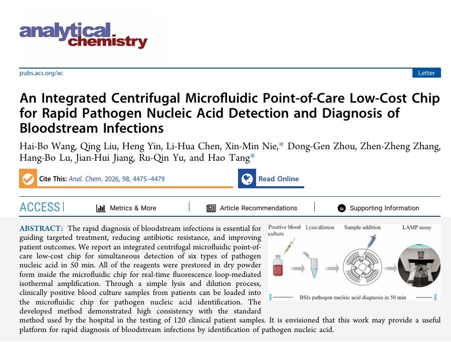 2月26日,记者从中南大学湘雅三医院获悉,该院聂新民教授团队联合湖南大学科研团队,成功研发出一款可在50分钟内精准检测6类常见血流感染致病菌的微流控芯片,成本仅需30元。这款物美价廉的芯片,有望为临床感染在诊断上抢出宝贵的“生死时速”。相关重要成果日前刊发于《分析化学》。