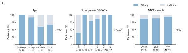 研究团队通过深入分析,探究了影响OTOF基因治疗效果的相关因素。研究发现,0.5–18岁未成年受试者的治疗有效性以及听力改善程度优于18岁以上受试者,其中0.5–3岁低龄儿童的治疗有效率达100%,3–8岁儿童达92%,8–18岁青少年达60%。治疗前基线DPOAE(畸变产物耳声发射)引出情况可预测治疗效果。DPOAE是评估耳蜗外毛细胞功能的重要指标,基线时在更多频率引出DPOAE的受试者,治疗后听力恢复效果更优,有望作为预测OTOF耳聋基因治疗效果的重要生物标志物。携带双等位基因非截短突变(NT/NT)的受试者,治疗后行为测听阈值优于携带截短突变(NT/T、T/T)的受试者,但不同突变类型的治疗有效率无显著差异,说明该疗法对不同类型OTOF基因突变类型均适用。