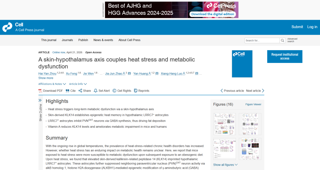 随着全球气温的持续上升,高温相关的慢性健康风险不断增加。高温暴露是否会对人体机体代谢产生持久影响,学术上仍缺乏清晰的认知。研究团队围绕全球变暖背景下高温暴露与代谢异常间的关系,开展了从队列研究、机制解析到干预验证的系统性工作,临床队列研究显示,高温暴露经历与内脏脂肪堆积、胰岛素抵抗、血脂升高等代谢功能紊乱相关,而维生素A治疗可抑制KLK14的产生并改善高温暴露人群的代谢异常。