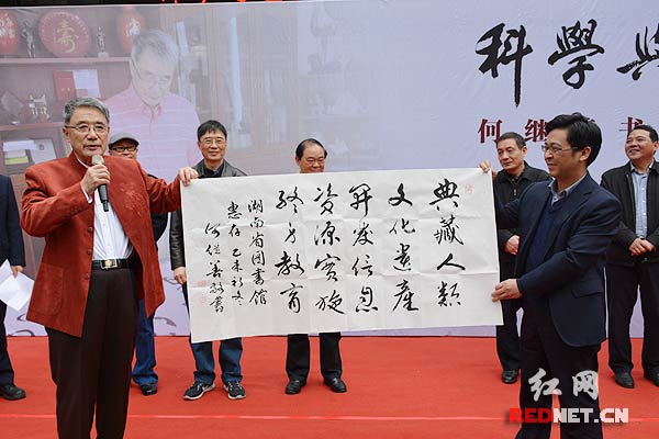 何继善院士(左)向湖南图书馆赠送书法作品及著作