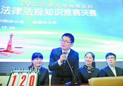 12月14日,中南大学湘雅医院,竞赛选手现场抢答法律法规知识问题。当天是国家宪法日暨法制宣传日,湘雅医院廉政风险防控办公室和团委开展了“笃法明礼,正行湘雅”法律法规知识竞赛。湖南日报记者 唐俊 摄
