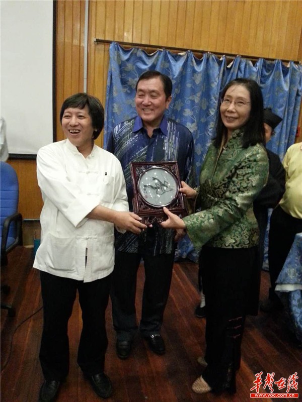 吕锡琛教授向马来西亚道教学院院长王琛发教授赠送礼物,马来西亚国际贸易与工业部第二部长、拿督斯里黄家泉先生见证。