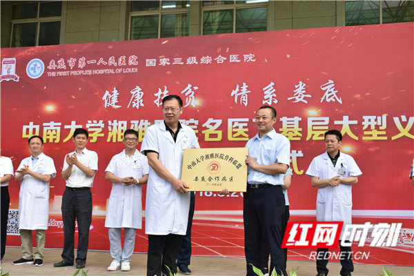 胡懿郃代表中南大学湘雅医院向娄底市第一人民医院授予“中南大学湘雅医院骨科联盟娄底合作病区”牌匾。