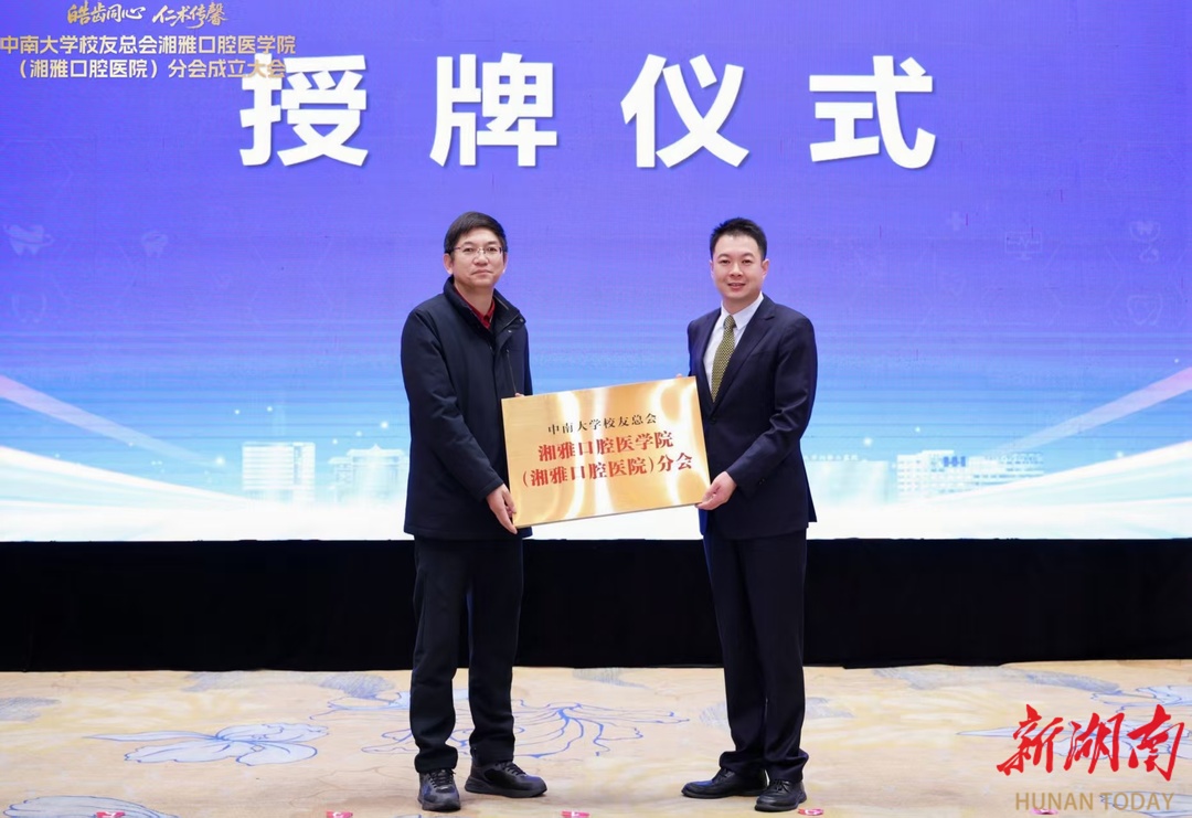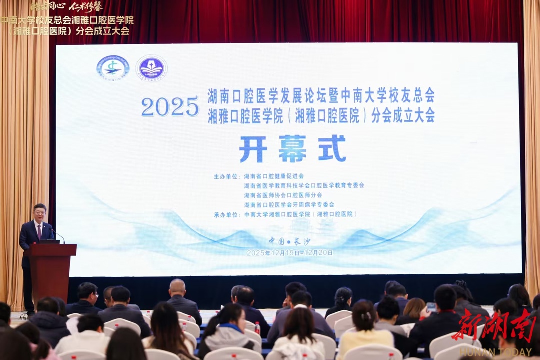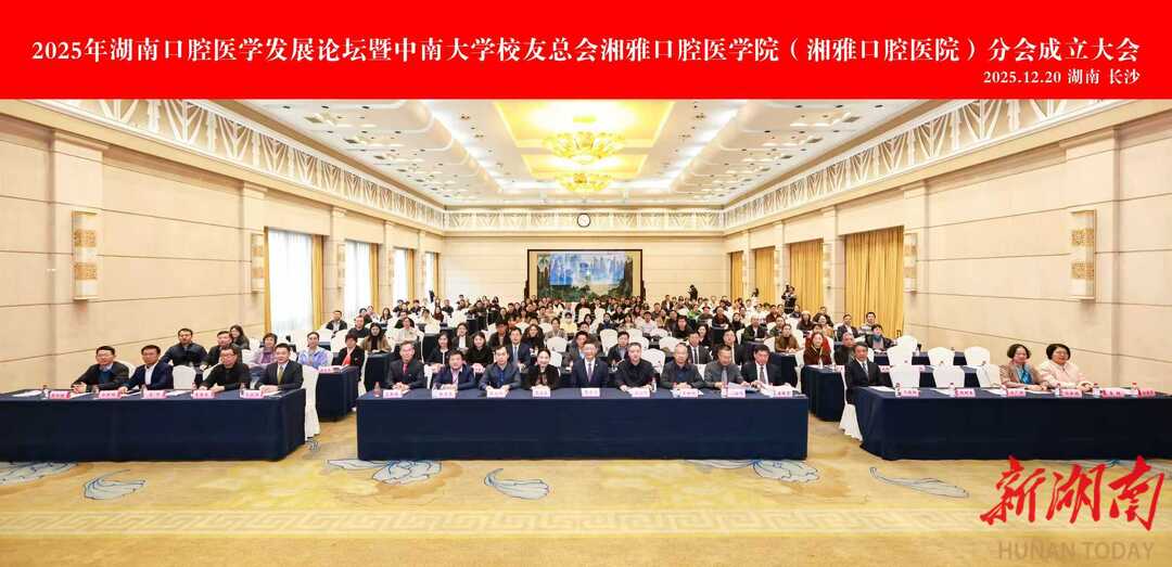 大众卫生报·新湖南客户端12月22日讯(通讯员 郑晓光)12月19日至20日,2025年湖南口腔医学发展论坛暨中南大学校友总会湘雅口腔医学院(湘雅口腔医院)分会成立大会在长沙召开,2025年湖南省口腔健康促进会学术年会、湖南省医师协会口腔医师分会学术会议、湖南省医学教育科技学会口腔医学教育专委会学术年会、湖南省口腔医学会牙周病学专业委员会学术年会同期召开。本次年会以凝聚校友力量、共话学科发展之名,邀请了国内口腔医学领域专家学者和广大校友相聚一堂,就口腔基础研究、临床应用、科技创新、教育教学等多个方面进行深入的探讨和交流,旨在共同推动湖南省口腔医学学科发展和提升口腔医学医疗服务水平。