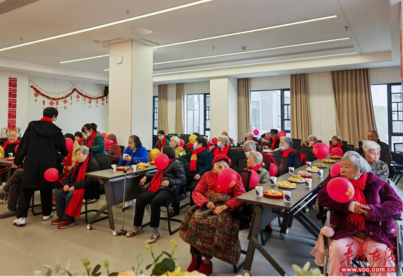 活动在热情洋溢的开场致辞中拉开序幕。随后,全场齐声合唱《好运来》,老人们随着音乐轻轻挥手,歌声中洋溢着对美好生活的向往与祝福。接下来的“零食套套乐”游戏环节笑声不断,老人们手持轻质套圈,专注投掷,每有收获便引来阵阵掌声与欢呼。