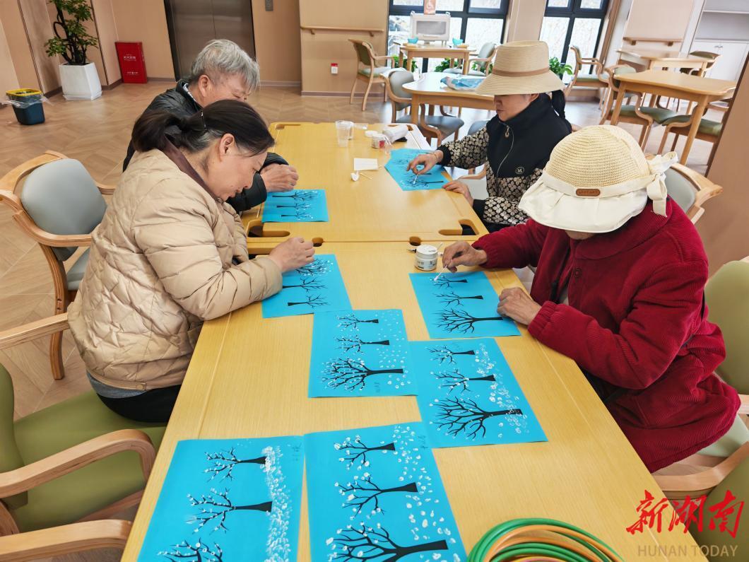 随后进行的“手绘时光”手工环节,中南大学公共管理学院学生进行细心讲解与协助。老人们用彩色卡纸和棉签创作出各具特色的绘画作品。整个过程大家互相学习、分享心得,现场洋溢着浓厚的艺术氛围。许多老人表示,这样的活动既动手又动脑,让人心情愉悦而且很有成就感。