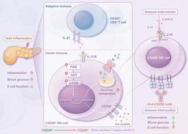 进一步的体外研究表明,IL-21可通过激活PI3K–AKT–mTOR信号通路,增强CD226⁺ NK细胞的细胞毒性功能;在体内层面,小鼠实验进一步证实,阻断该互作轴的多个关键环节,包括使用IL-21敲除(KO)小鼠、IL-21R Fc融合蛋白、mTOR抑制剂雷帕霉素或抗CD226单抗,均可有效延缓糖尿病发生,减少胰岛内CD226⁺ NK细胞浸润并缓解局部炎症反应。