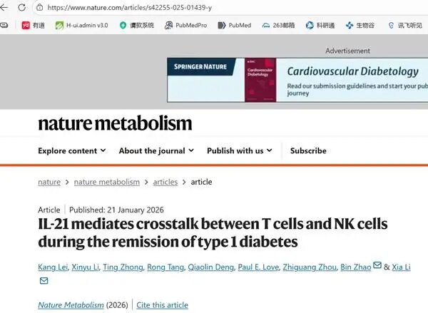 近日,中南大学湘雅二医院内分泌与代谢性疾病国家临床医学研究中心李霞教授与赵斌教授团队在代谢领域权威期刊《自然·代谢》(Nature Metabolism,IF=20.8)发表研究论文《IL-21介导的T细胞与NK细胞在1型糖尿病缓解期的相互作用机制》(IL-21 mediates crosstalk between T cells and NK cells during the remission of type 1 diabetes),揭示了1型糖尿病缓解期关键免疫互作机制。中南大学湘雅二医院代谢内分泌科博士雷康、李新羽、钟婷为共同第一作者。