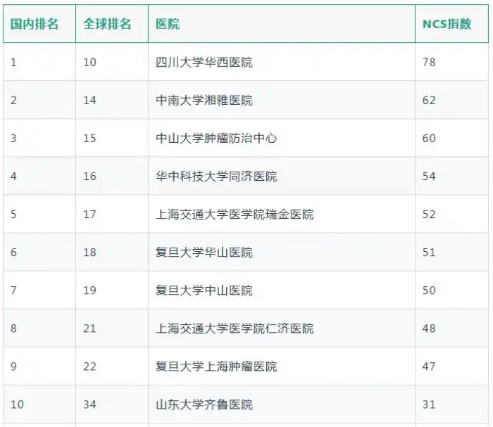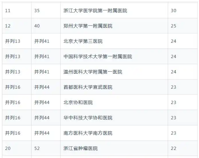 在Cell、Nature、Science三大顶刊及其核心子刊的发文全球前100名医院中,中国大陆医院共有42家上榜,数量超过了美国(29家)位居世界第一。中国有7家医院(四川大学华西医院、中南大学湘雅医院、中山大学肿瘤防治中心、华中科技大学同济医院、上海交通大学医学院瑞金医院、复旦大学华山医院、复旦大学中山医院)进入全球前20名,占据了全球前20名的三分之一席位。