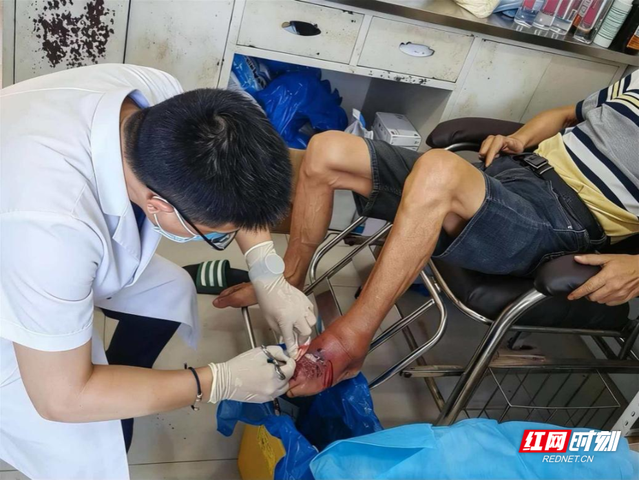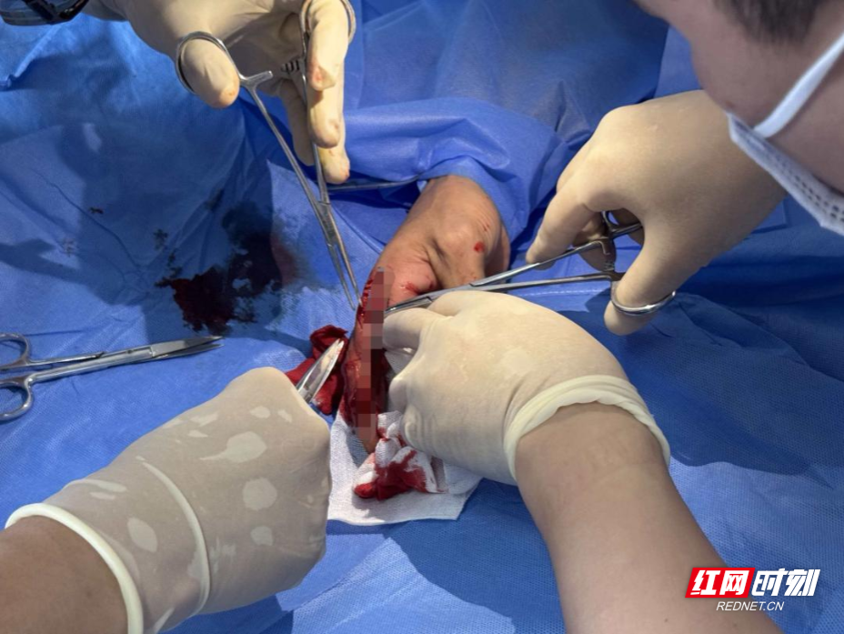 诊室内,黄先哲医生主刀,邵阳市中心医院普外科副主任医师王雄宇担任助手,湖南省肿瘤医院副主任护师谭艳配合器械。清创、探查、对合组织、分层缝合……十余针细密缝合后,再以弹力绷带妥善固定。1个半小时的手术结束时,夜色已笼罩诊室。患者看着重新成形的手指,连声道谢。