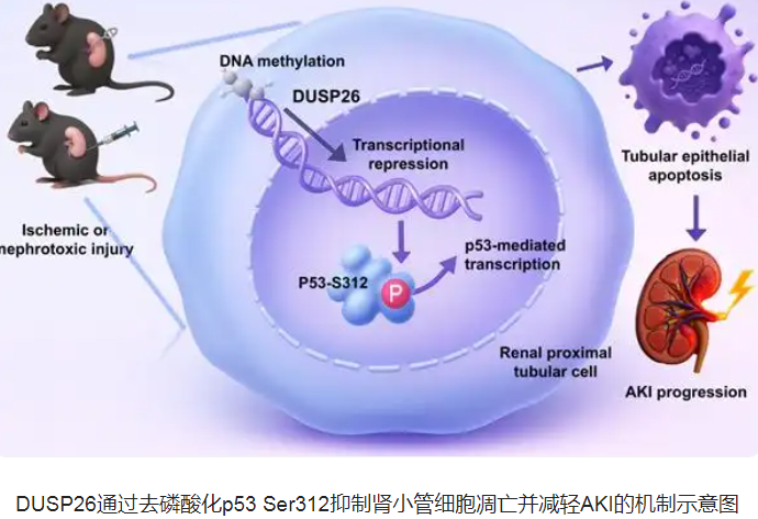 更为重要的是,研究团队从机制上阐明了DUSP26-p53这一关键调控轴。研究证实,DUSP26可直接结合p53,并特异性去磷酸化其Ser312位点,从而抑制 p53 对细胞死亡相关基因的转录激活,减轻肾小管上皮细胞凋亡与损伤。相反,当DUSP26下调时,p53 Ser312 位点磷酸化增强,促凋亡转录程序被激活,最终推动AKI进展。该研究由此建立了“DUSP26下调—p53异常激活—肾小管损伤加重”的关键机制线索。