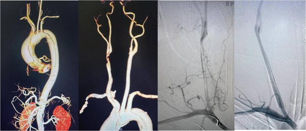 凭借极致的精准操作,团队通过手术切开暴露桡动脉,成功建立介入治疗通路,顺利在堵死的右侧颈动脉里植入2枚支架,把被夹层压扁的血管完全撑开。术后造影显示,患者右侧大脑的血流瞬间恢复通畅,第一关圆满成功。