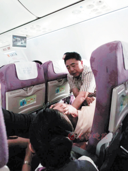 昨日下午1时20分,飞机即将到达目的地,正在准备下降。忽然,机上一位老人口吐白沫,牙关紧闭,四肢抽搐。邻座乘客赶紧报告空姐,空姐随即在机上发出求助广播。前往大连出差的中南大学湘雅二医院党委副书记薛志敏教授、第三党支部书记肖树副主任护师正好在航班上。他们立即开展救治。