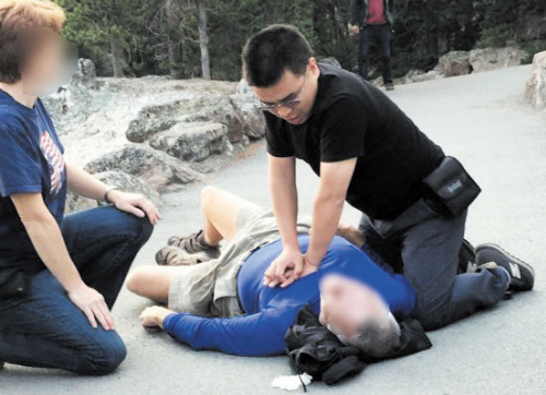23日恰逢周日,刘振江正在黄石公园游览。晚上7时许,他行经一处景点时,突然听到呼救声。他循声望去,见一位老年游客正在地上抽搐。刘振江赶紧上前,发现老人心跳呼吸骤停后,立即为他进行徒手心肺复苏,并请周边的游人赶紧拨打急救电话。