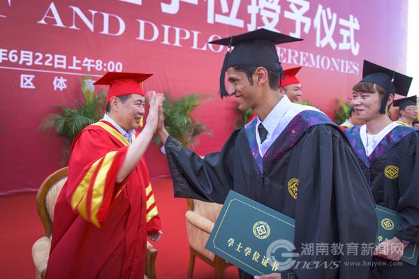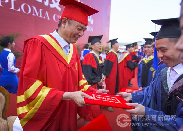 常务副校长胡岳华宣读中南大学学位委员会决议,8087名本科生获学士学位,5071名研究生获硕士学位,636名博士生获博士学位。院士和校领导们为获得学位的毕业生代表颁发学位证书、挑苏留影。