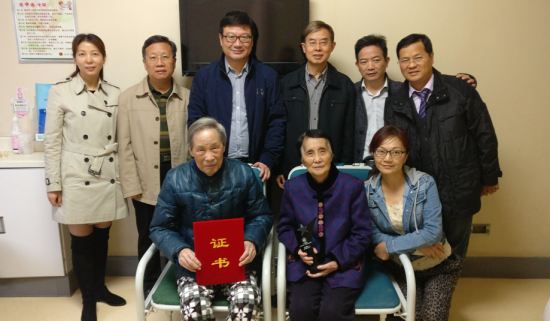 (图为儿童医学中心工作人员看望生病住院的谢振武教授并送上大会授予的奖杯)