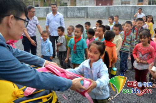 随后,支教团的队员们为列队站好的孩子们依次发放了爱心书包,拿到爱心包的孩子们十分开心,迫不及待的将新书包背在肩上。