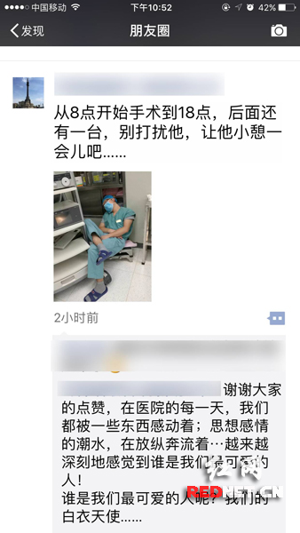 记者随即联系到了中南大学湘雅二医院宣传办负责人,他向记者介绍,当天,尹丹辉和同事们共完成了6台手术,这张照片是同事在他最后一台手术前拍的。最后一台手术直到晚上10点多才结束。等病人醒了后,尹丹辉和麻醉医生一起把病人送回病房,才吃了晚饭。